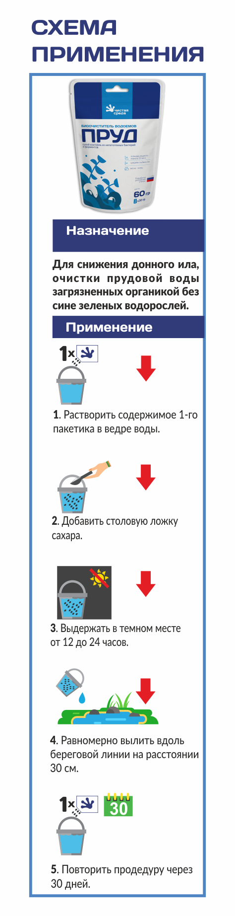 Средство из одного пакетика равномерно рассыпать вдоль береговой линии не ближе 30 см от берега. Для удобства рекомендуем сначала содержимое пакетика высыпать в ведро с водой, перемешать. Далее равномерно вылить вдоль береговой линии. Процедуру повторить через 30 дней.