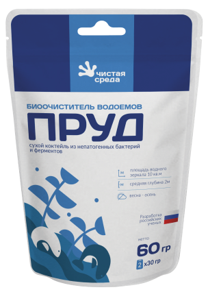 Предназначен для водоемов загрязненных органикой, пораженных цветением и мутностью воды. Средство очищает воду, понижает уровень донного ила и отложений органических веществ, восстанавливает кислородный режим, ускоряет отмирание патогенных микроорганизмов. Создано российскими учеными на основе микроорганизмов постоянно присутствующих в почвах России. Средство нетоксично для человека, животных, растений.